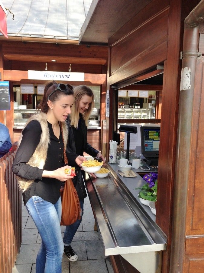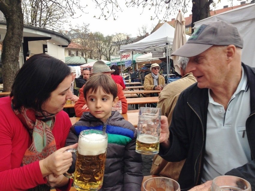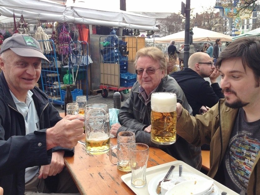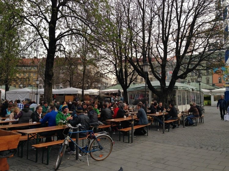 Pronto. Você acaba de descobrir na prática a primeira regra dos biergartens na Alemanha: a da boa convivência. Dois velhinhos, respeitosamente escoltados por canecões de cerveja, convidavam Nathalia, Joaquim e eu para sentarmos com eles. Nossa estreia num biergarten foi no Viktualienmarket, mercado em Munique.