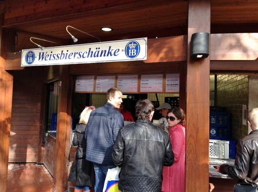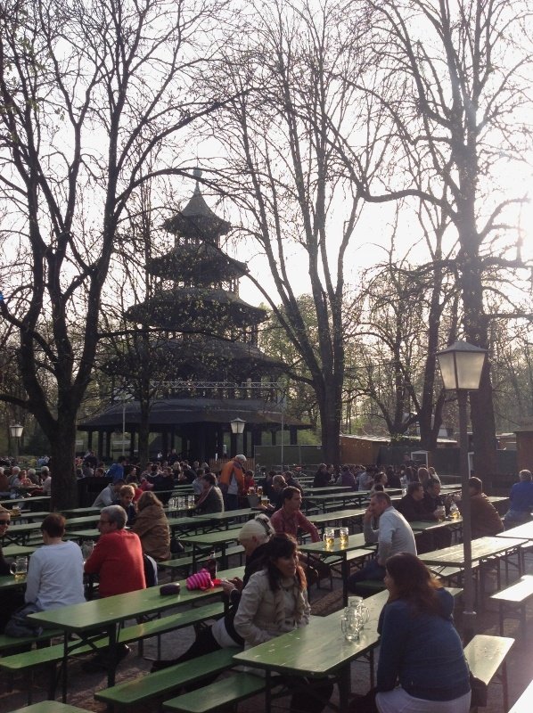 Nós fomos ao biergarten da Torre Chinesa (Chinesischer Turm), que se localiza dentro do Englischer Garten (Jardim Inglês de Munique). No grande parque urbano de Munique há também um jardim de cerveja às margens do lago Kleinhesseloher e até um pequeno ponto de venda da cervejaria Hofbräuhaus, versão reduzida da conhecida casa no centro de Munique. O biergarten da torre chinesa é o segundo maior da cidade. Conta com 7.000 lugares, aproximadamente. Alguns bancos têm encosto. No canto fica a parte de venda de comida e de cerveja. Nem é preciso abrir a boca para comprar a bebida. Você entra numa fila, bota o dinheiro num pratinho e pega uma das muitas canecas cheias que repousam sobre o balcão. O esquema é igual nos quiosques do Viktualienmarkt. É ou não é o drive-thru dos sonhos de quem ama cerveja?