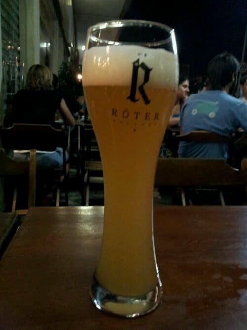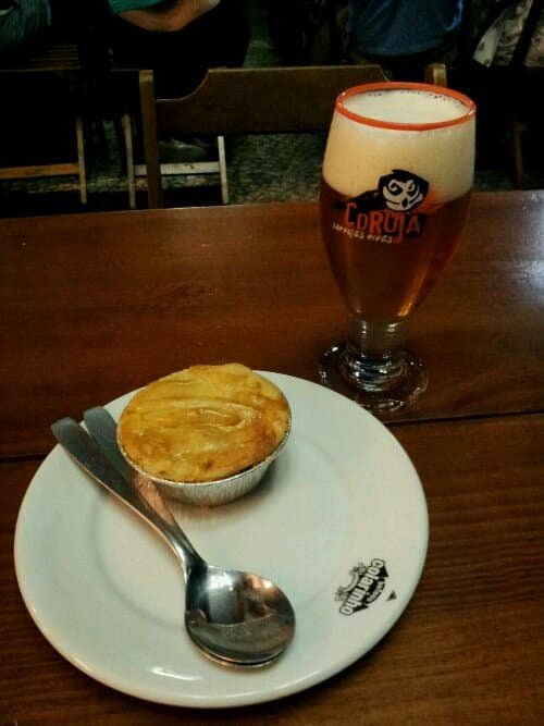 De cara, pedi um Roter Brauhof, que eu tinha visto na mesa ao lado, com aquele amarelo turvo delicioso. Bem levinho, gostoso, mas eu ainda provei um Corujas Extras, amargo na medida para mim. Para acompanhar (porque eu não sei beber sem petiscar), escolhemos um bolinho de gorgonzola e empadas. Eu não sou do time dos loucos por empada, muito menos de palmito, mas devo admitir que não vejo a hora de comer de novo aquela. A massa é fininha e o recheio um creme de palmito temperado com alho.