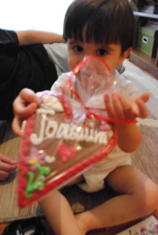 Os adultos bebem um vinho quente que vem numa caneca e comem um cachorro-quente com uma salsicha comprida e magrela. As crianças adoram os biscoitos de coração. Eles têm desenhos de Papai Noel e de flores, e uma palavra escrita bem no meio. A mamãe do Joaquim pediu para a moça escrever o nome dele no coração. O biscoito é durinho, e a mamãe carregou com muito carinho, então ele chegou para o Joaquim inteirinho. Ele adorou o coração e o gosto de canela!