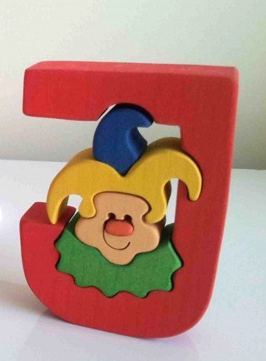 Foi quando ela viu uma barraquinha de brinquedos de madeira, cada um mais divertido que o outro. Leõezinhos, árvores e letrinhas eram como quebra-cabeças. O moço que fabricava os brinquedos queria que as crianças pudessem montar e desmontar as formas. Ele era muito criativo! Inventava letrinhas com desenhos dentro. A mamãe não resistiu e comprou o J com o palhacinho para o Joaquim.