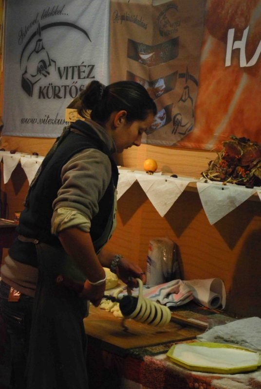 Numa outra barraquinha, tinha um doce grandão. A moça fazia uma minhoca de massinha e enroscava grudadinha num tubo. Depois, ela cobria de açúcar e botava para assar numa churrasqueira. O nome desse doce é kürtőskalács. Uma palavra esquisita. Mas isso era só o começo. Os nomes na Terra de Reis e Rainhas enrolaram a língua da mamãe do Joaquim muitas vezes.