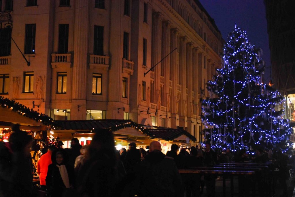 O mercado de Natal terminava (ou será que começava?) numa praça. Uma árvore de Natal gorducha, com fios e mais fios de luzinhas azuis, deixava ainda mais bonito o karácsonyi vásár. Era assim que as pessoas de lá chamavam o mercado de Natal. Eu não disse que as palavras ali enrolavam a língua?