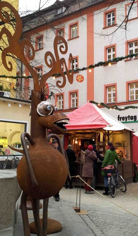 Regensburg é um lugar muito fofo. As ruas tortas e fininhas vão se emendando e levando a gente até as praças da cidade. Andando para lá e para cá, a mamãe viu a rena mais diferente de todas. Era dentuça e tinha os olhos esbugalhados. Que engraçada, o Joaquim ia adorar!