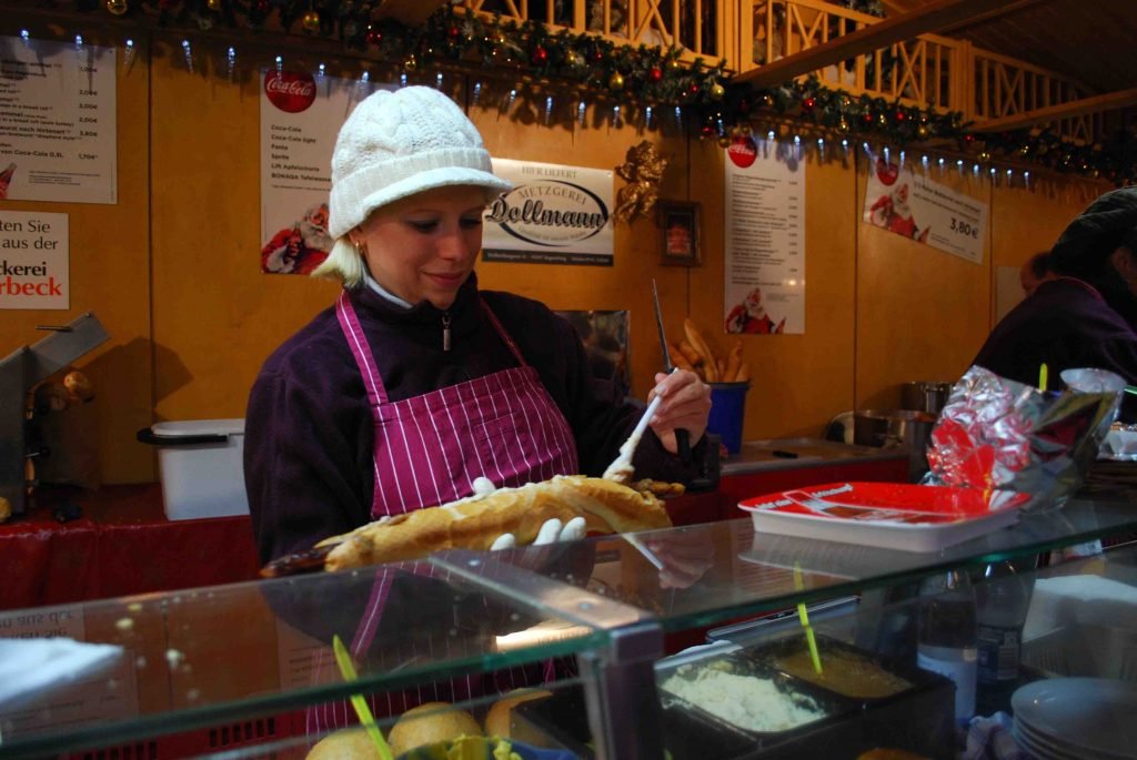 As pessoas também vendem biscoitos, enfeites e até salsichas! Foi no mercado de Regensburg que a mamãe do Joaquim provou a salsicha caseira mais gostosa que experimentou na Alemanha. A família que fazia e vendia a salsicha era muito animada. Acho que aquela felicidade passava para o gosto da salsicha por que ela tinha um temperinho delicioso.