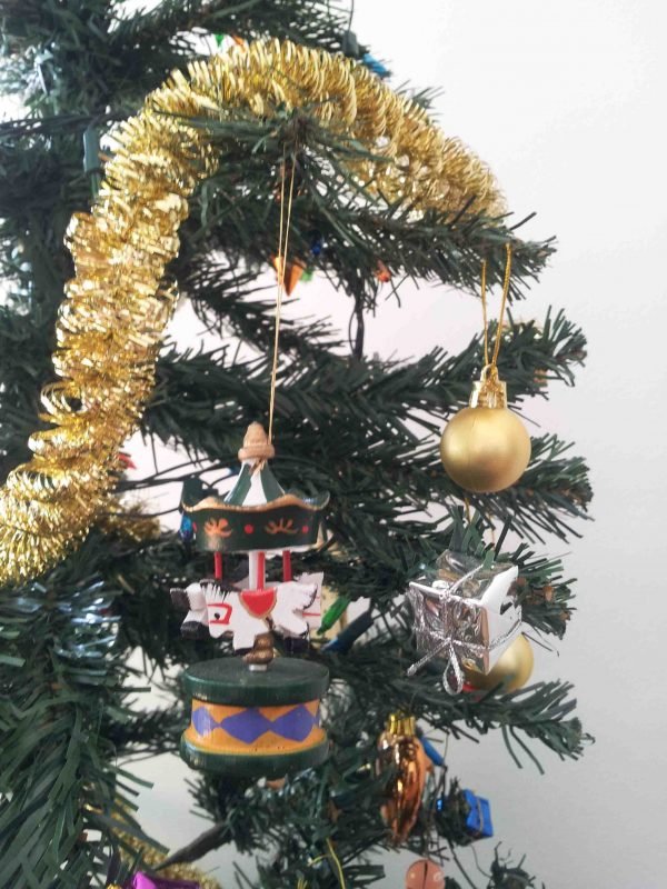 Sonhando em arrumar a casa para o Natal com o Joaquim, a mamãe comprou um carrossel verde e também levou um Papai Noel sentado num trenó. Tudo para trazer na mala um pouquinho daquele momento especial.