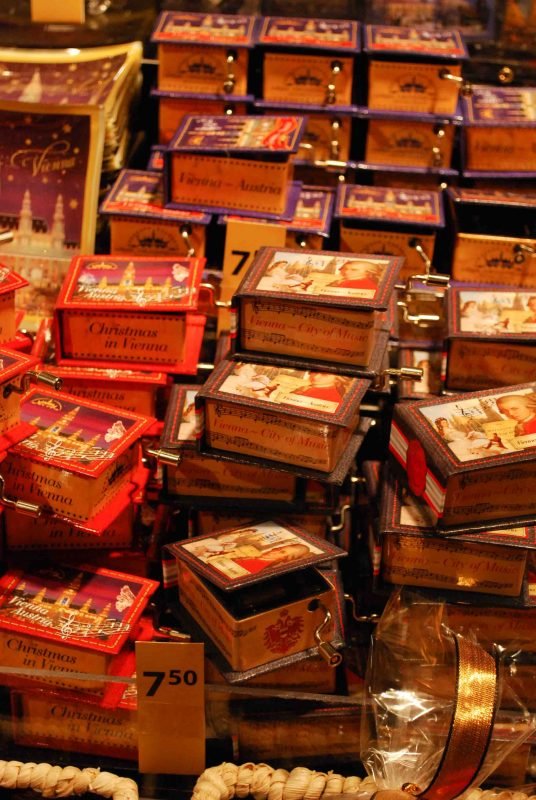 A mamãe do Joaquim passou o restinho da tarde vendo enfeites de Natal. Eram tantos, e tão fofos! Numa barraquinha, rodas-gigantes e trenzinhos se mexiam enquanto canções natalinas tocavam. Em outra, estavam montanhas de caixinhas de música porque Viena é conhecida como a cidade da música.