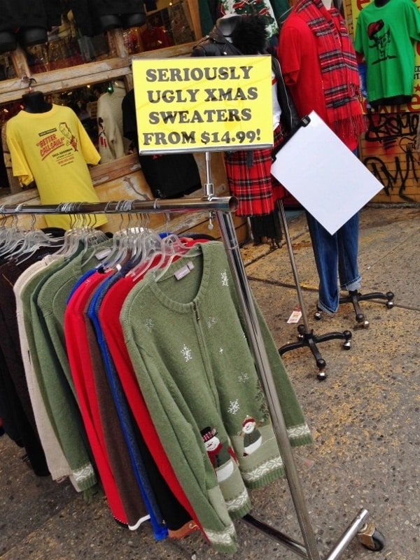 Sobram nas lojas artigos com desenhos natalinos. Vi suéter com boneco de neve, Papai Noel e até cachorro-rena. A moda de fim de ano motivou uma boa dose de autocrítica numa loja do multicultural bairro de Kesington Market, que ostentava a plaquinha Seriously Ugly Xmas Sweaters (algo como horrorosos suéteres de Natal).