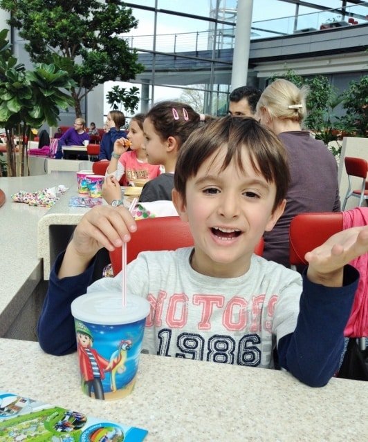 E de cada mordida de Joaquim no nugget ou na batata frita (nas férias, está valendo!). Compramos o combo do menu infantil, com suco de bebida. Pagamos 2 euros de depósito para cada prato e cada copo. A quantia é devolvida no fim da refeição, se apresentado o recibo com a louça suja. Devolvemos tudo, mas optamos por ficar com os 2 copos com a carinha do boneco. Em casa, embalam sucos, vitaminas e lembranças nas refeições desse pequeno, hoje com 8 anos, a cada dia maior.