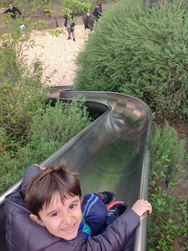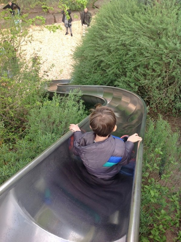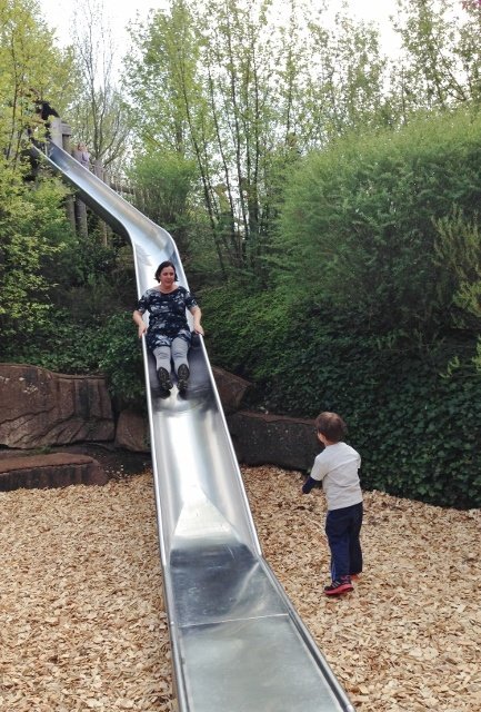 Desceu muitas vezes. Não bastava. Ele queria compartilhar sua alegria (sem botão de rede social, obviamente). “Vem, mamãe! Vem, papai! Escorrega!” A felicidade dele era tão contagiante e os escorregadores estavam ali chamando… Não tinha nenhuma placa de ‘kids only’, vimos um alemão seguir os filhos e, então, entendemos que tudo bem. Criamos coragem e aceitamos o convite. Que delícia!