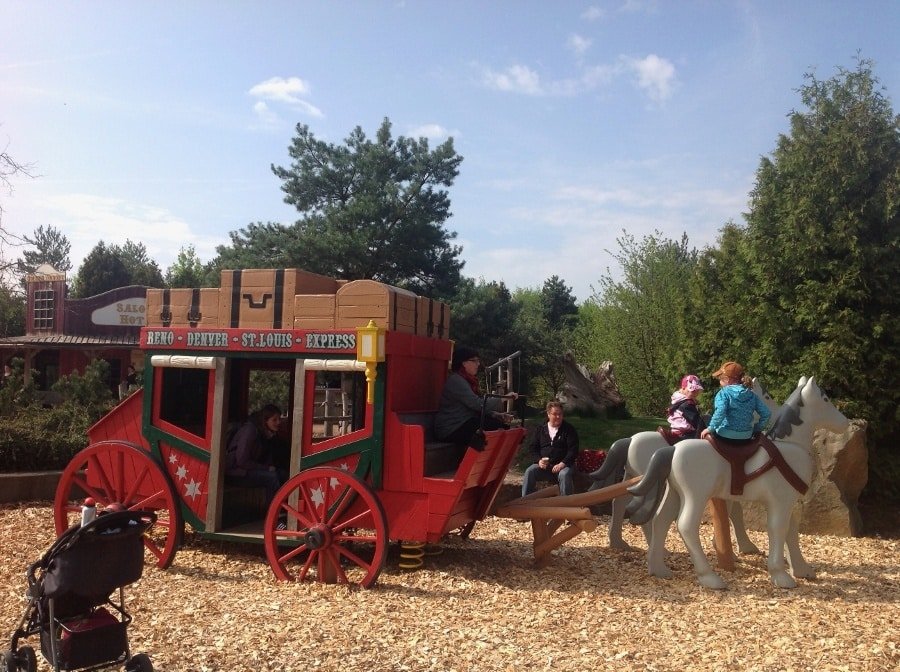 À direita da área do Velho Oeste, há um lago e uma ducha. Dependendo do calor, pode ser uma boa levar uma muda de roupa para trocar as crianças se elas resolverem testar o chuveiro. O próprio site do parque faz essa recomendação, além de indicar que pode ser útil pôr na bolsa roupa de banho para a garotada se refrescar no playground molhado (Wasserspielplatz).