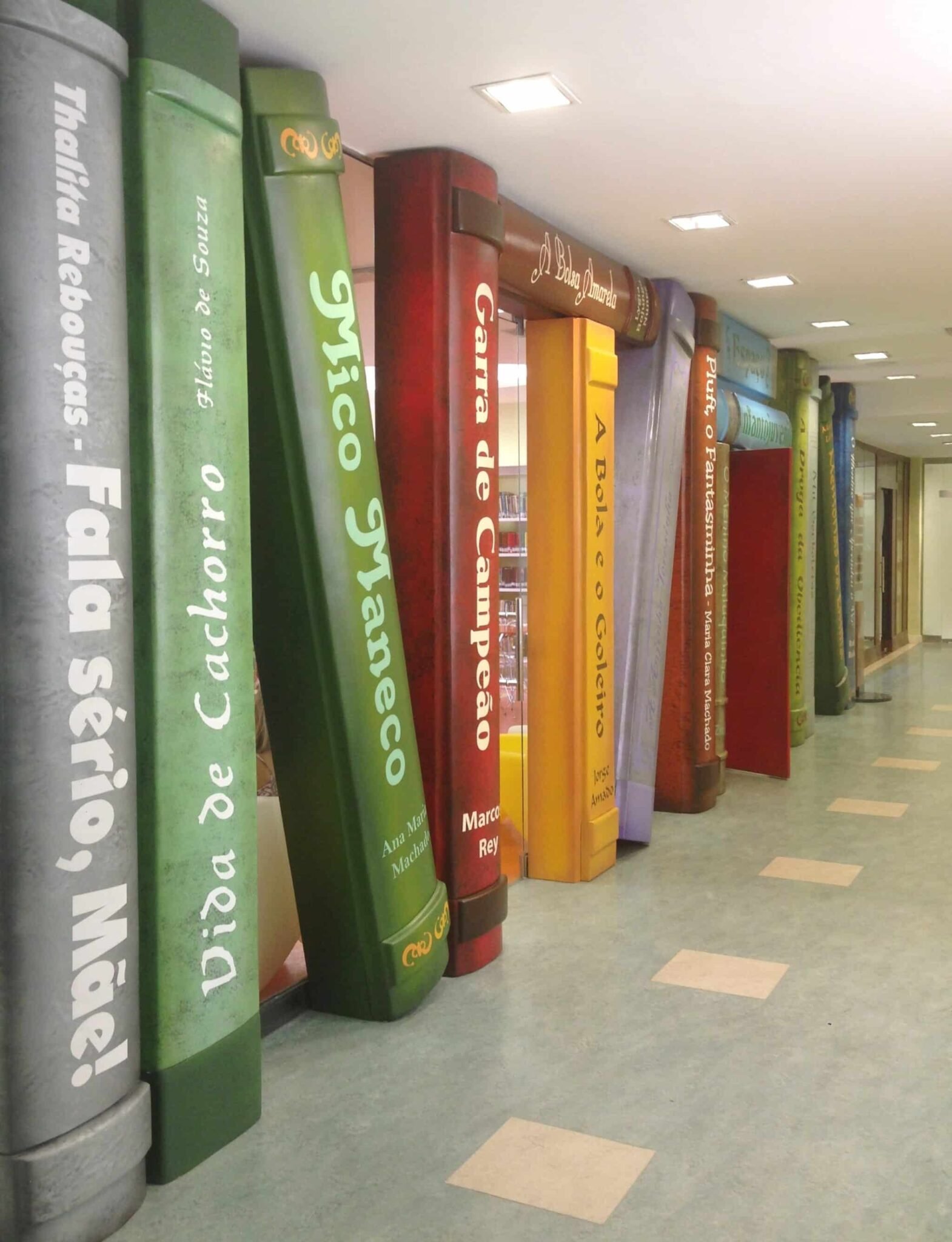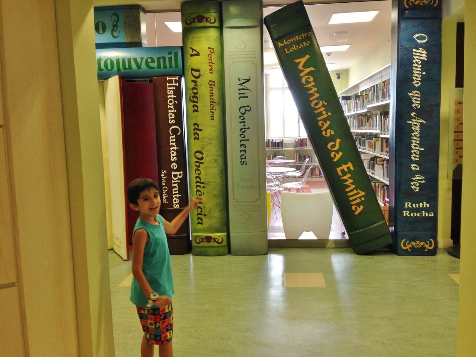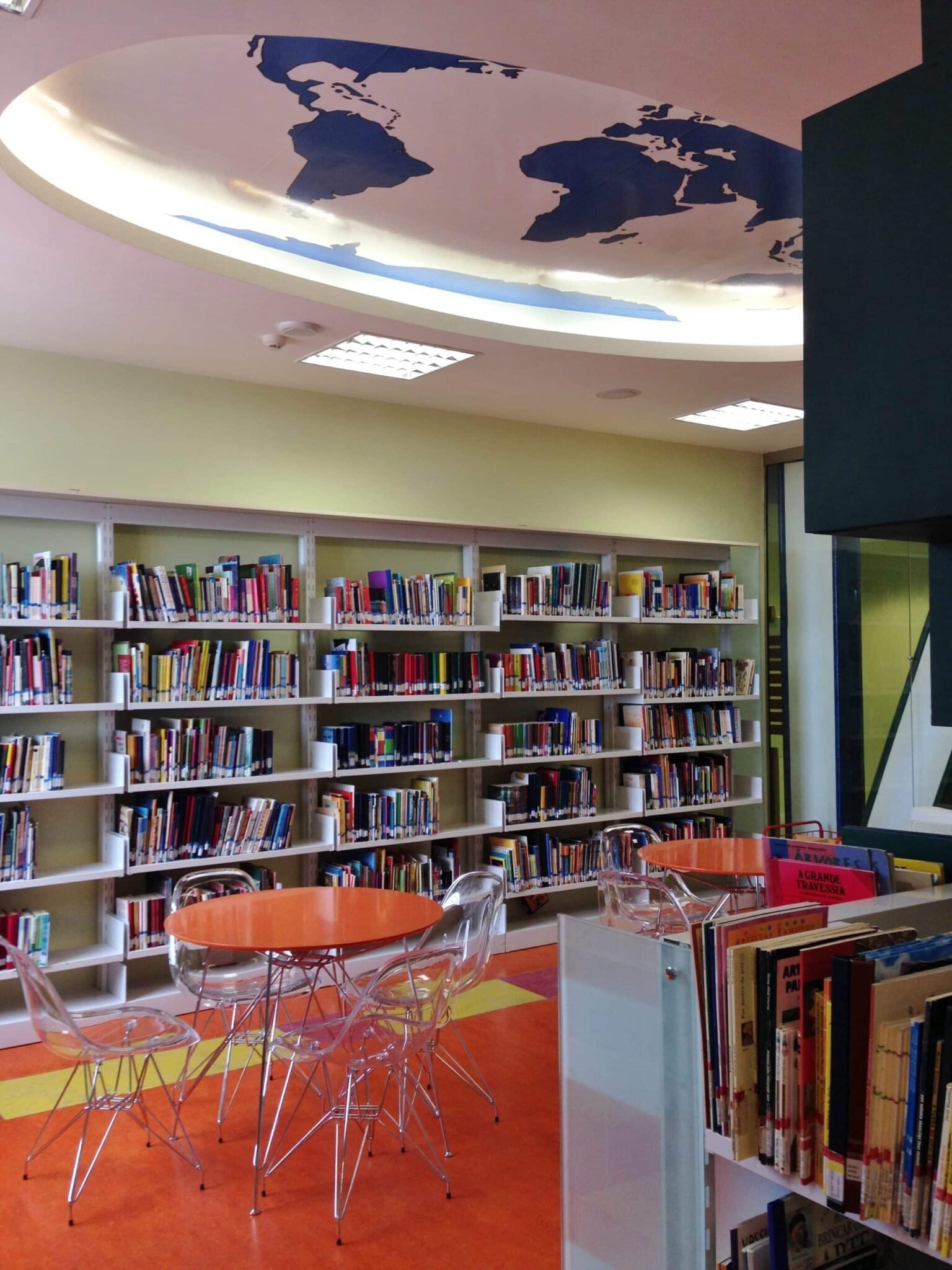 Fiquei encantada, especialmente com a área infantil. A parede da entrada simula capas de livros de clássicos para esse público, e a porta giratória imita as páginas. Coisa mais linda ver aquele colorido. O espaço é dividido em 2 ambientes preparados especialmente para crianças e adolescentes. Uma estante separa bem as áreas, e até o mobiliário é adequado a cada faixa etária.