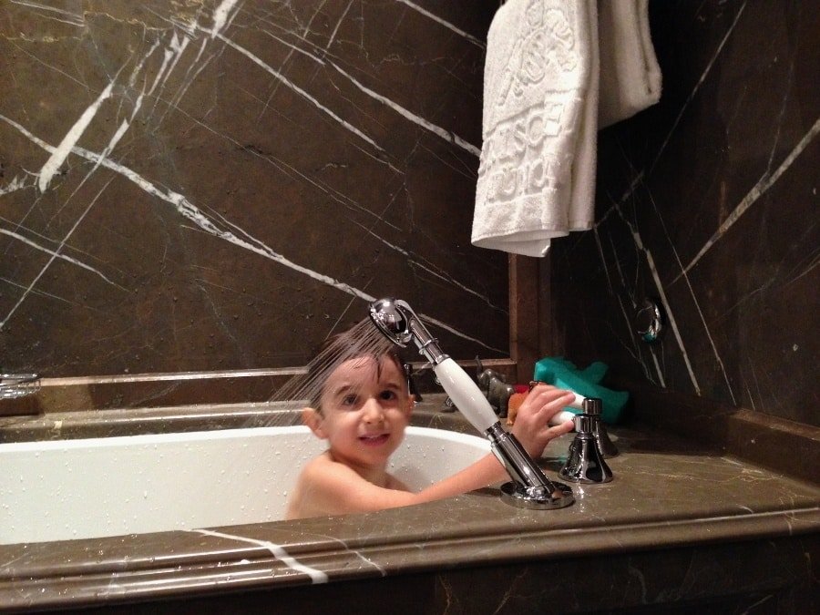 Ele também adorou a ideia de poder sair do chuveiro e não sentir frio ao tocar o piso aquecido. Se bem que havia pantufas do tamanho de seus pés à espera dele na chegada ao quarto, sem falar no roupão infantil com o qual nosso pequeno lord se vestia ao sair do banho de banheira diariamente.