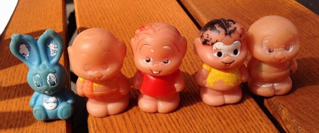 Dois desses bonequinhos de borracha vieram da Alemanha para o Brasil e por aqui ganharam o nome de ‘bundinhas de fora’, dada a escassez de suas vestes. Viraram personagens das brincadeiras que Joaquim organiza com Lego e Playmobil aqui em casa.
