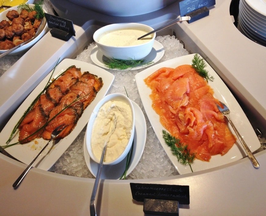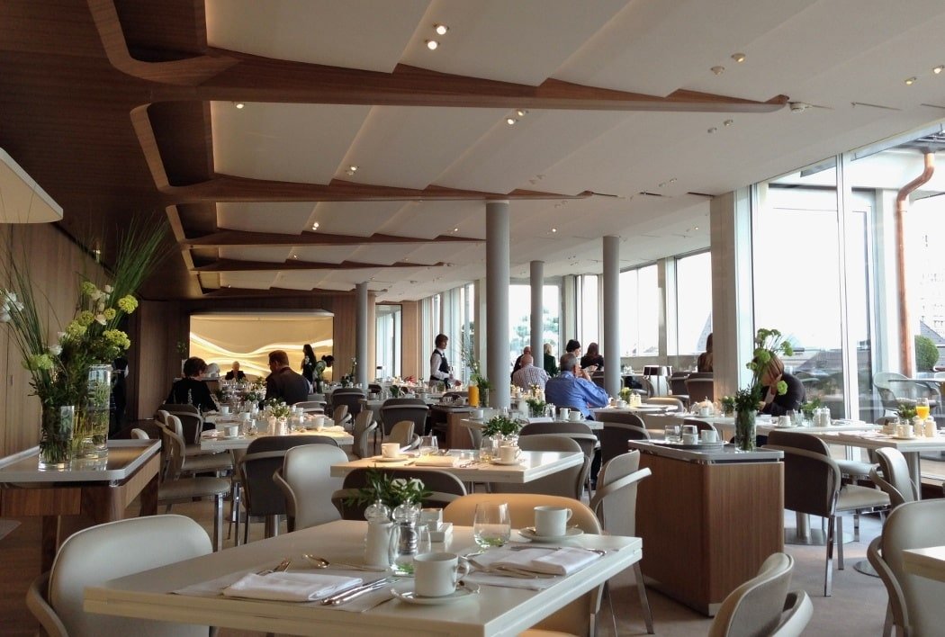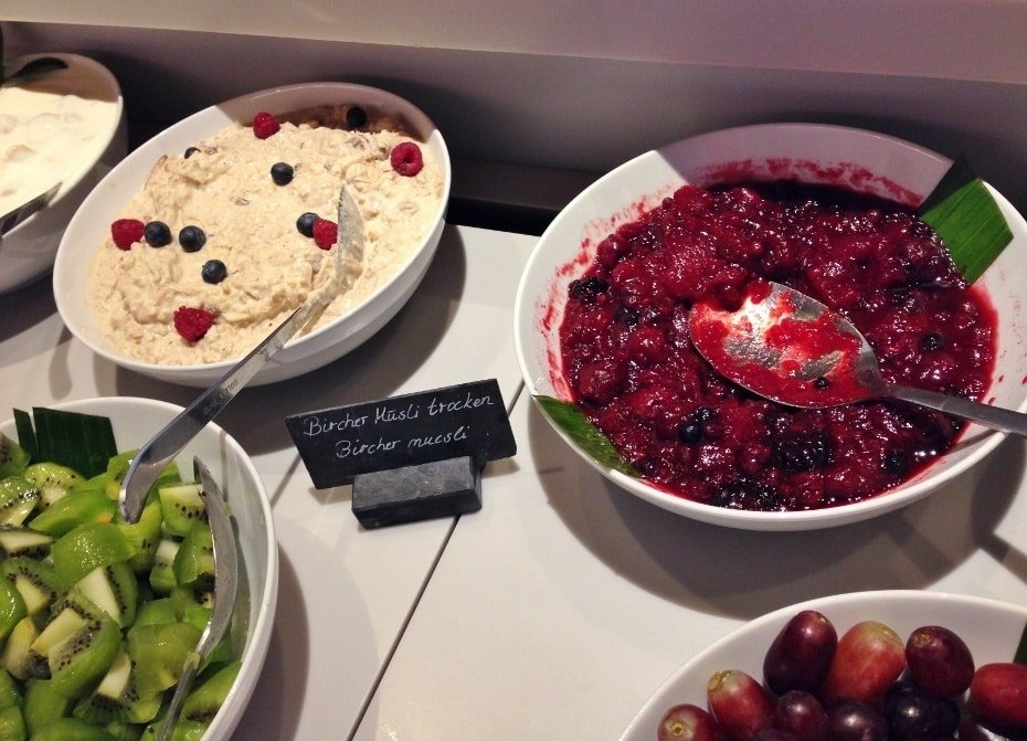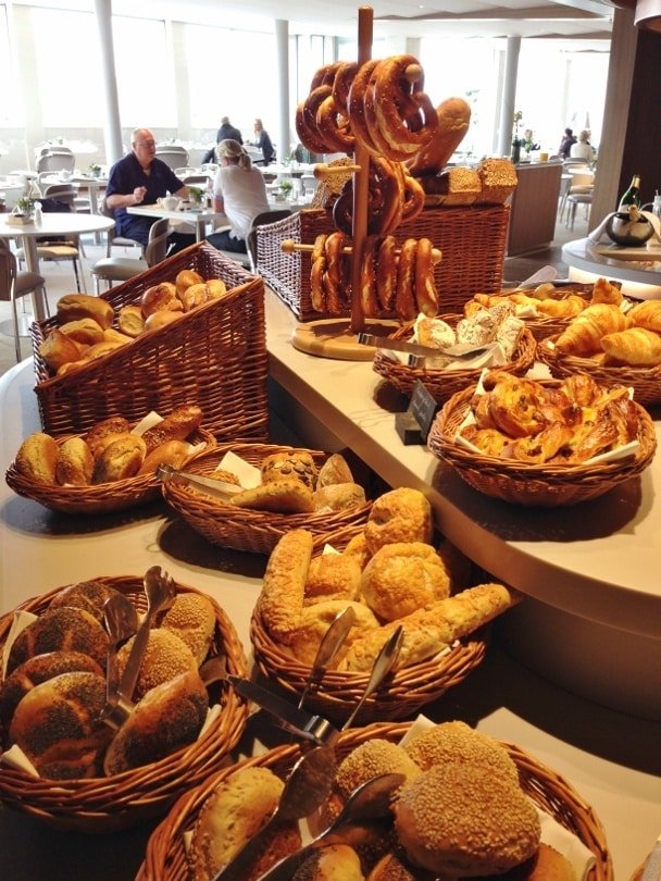 Nossa estada no Bayerischer Hof incluía começar o dia com um ótimo café da manhã. Aqui prefiro classificá-lo como pequeno almoço, essa expressão genialmente consagrada em Portugal para definir a primeira refeição, o que naquele caso fazia todo sentido. Dispenso novas linhas para não brigar com as fotos que mostram o repertório do buffet. Mas é preciso mencionar que de espumante a salmão, passando por diversos tipos de pães, incluindo as deliciosas especialidades alemãs, tudo era uma tentação para os que, assim como nós, prezam um generoso café da manhã.