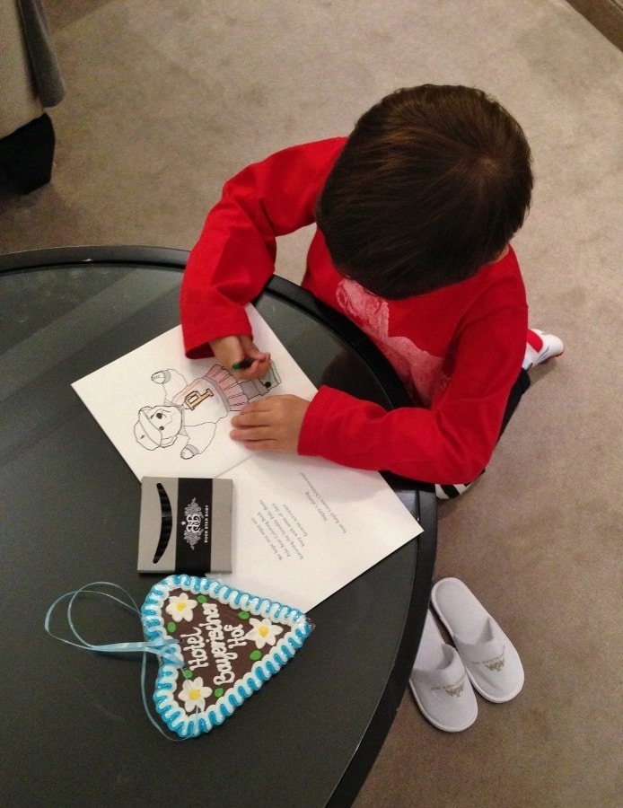 Éramos três e ficamos em um quarto desenhado por Siegward Graf Pilati (outros três arquitetos se dividem nas assinaturas das demais acomodações). Uma ótima cama king size, uma mesa de trabalho e uma pequena sala de estar compunham o ambiente. Para o Quim, uma pequena cama foi armada aos pés da nossa, de frente para a TV (não poderia haver melhor lugar, mesmo ele não entendendo nada do alemão dito nos desenhos animados que pedia para assistir antes de dormir).