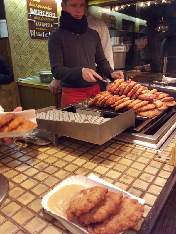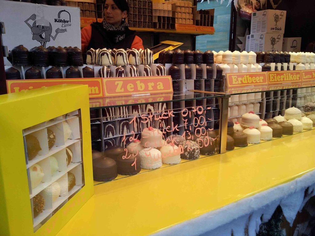 Em Frankfurt, as pessoas também vendiam vinho quente, salsichas e biscoitos de coração, e mais um monte de outras comidas. Como tinha comida! O mercado de Frankfurt foi o mais variado de todos. A mamãe viu barraquinha até de nhá benta, aquele doce fofinho coberto com chocolate.