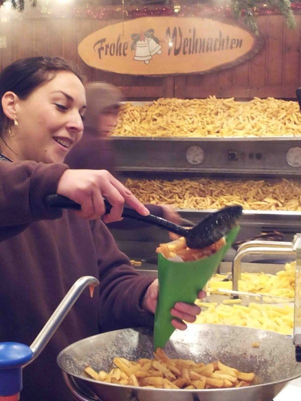 O Joaquim ia se lambuzar na barraquinha de batata frita. Os moradores de Frankfurt se lambuzam. As pessoas fritam quilos e mais quilos de batata para a festa.