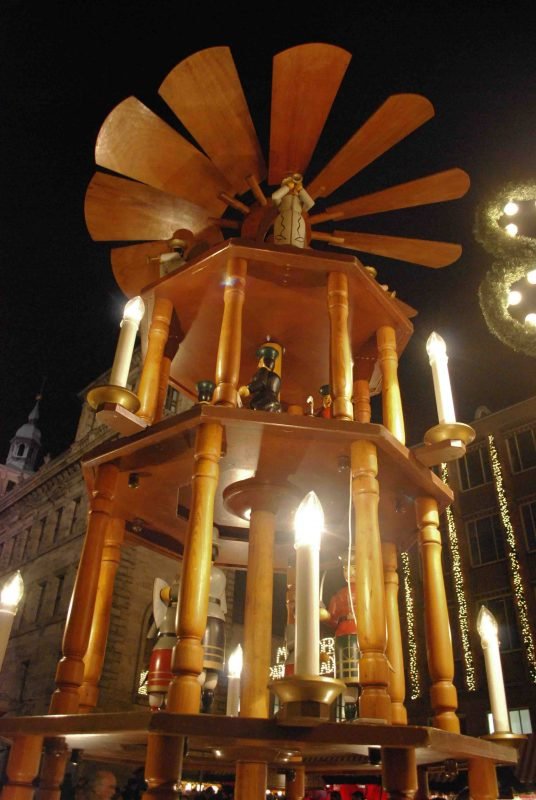 Foi em Nuremberg que a mamãe do Joaquim viu sua primeira árvore de Natal de madeira. Ela tinha vários andares, com bonequinhos. A árvore começava grande e ia afinando até chegar lá em cima, e tinha lugar para acender velas em volta dela. Essa é uma árvore de Natal bem comum na Alemanha. O calor das velas faz girar a hélice no alto e também os bonequinhos nos andares.