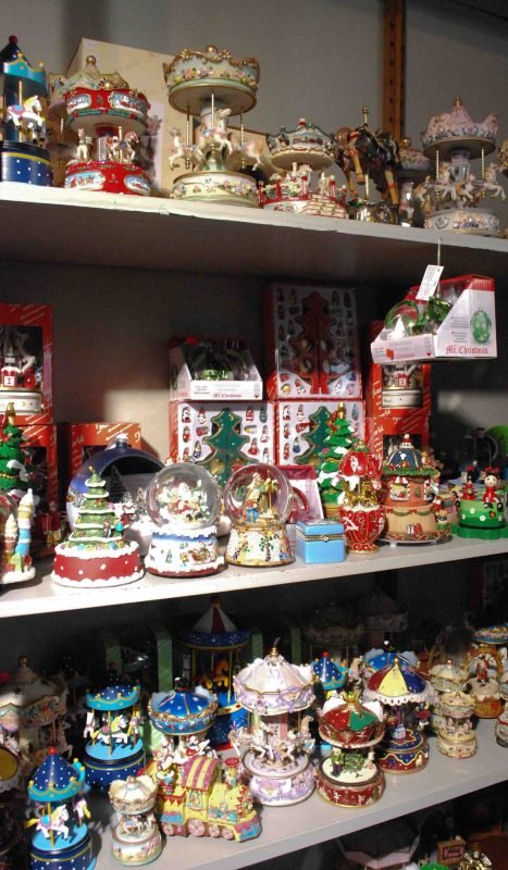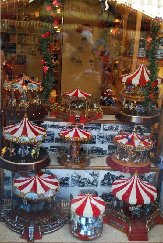 O museu fica na rua principal de Rüdesheim. Quando a mamãe do Joaquim saiu de lá, deu de cara com lojinhas que vendem caixinhas de música. Muitas eram carrosséis, que giravam enquanto a música tocava. As caixinhas das lojas não eram grandes como aquele armário do museu. Eram pequeninhas e encantadoras.