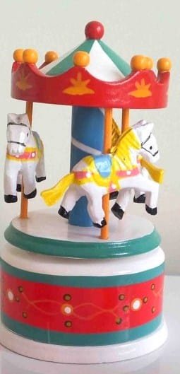 A mamãe ficou tonta, sem saber o que comprar. Ela queria uma caixinha delicada como seu pequeno Joaquim. Depois de ver várias, a mamãe escolheu um carrossel de cavalinhos brancos, que cabe nas mãozinhas do Joaquim. Ele roda o topo do carrossel e ele dá corda.